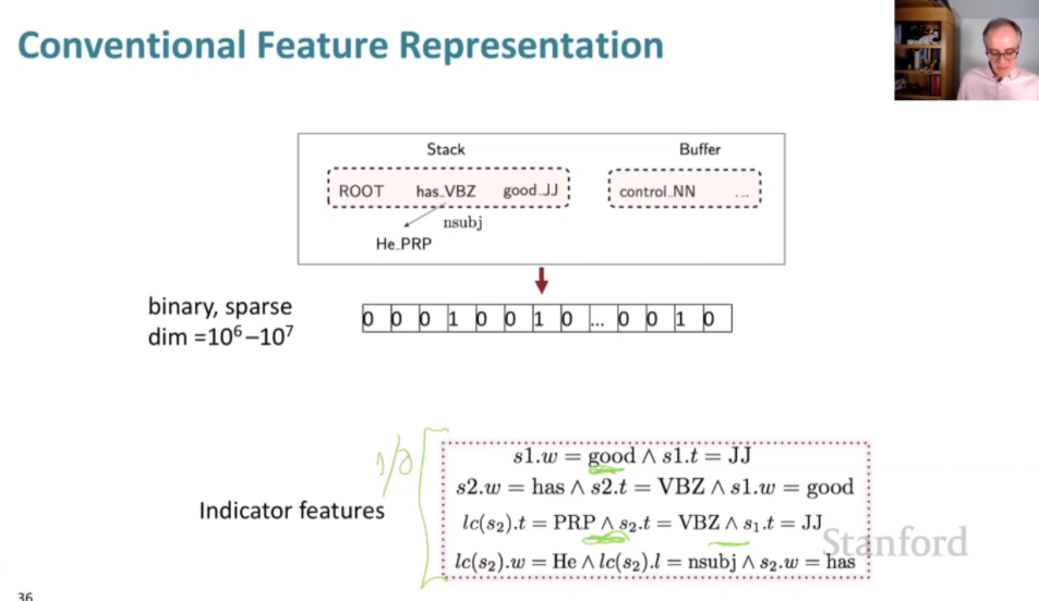 기존의 Feature Representation을 설명하시는데, 이는 Nivre 가 만든 dependency parser이다. 이것의 Neural form 은 다음에 설명한다고 말씀하신다.