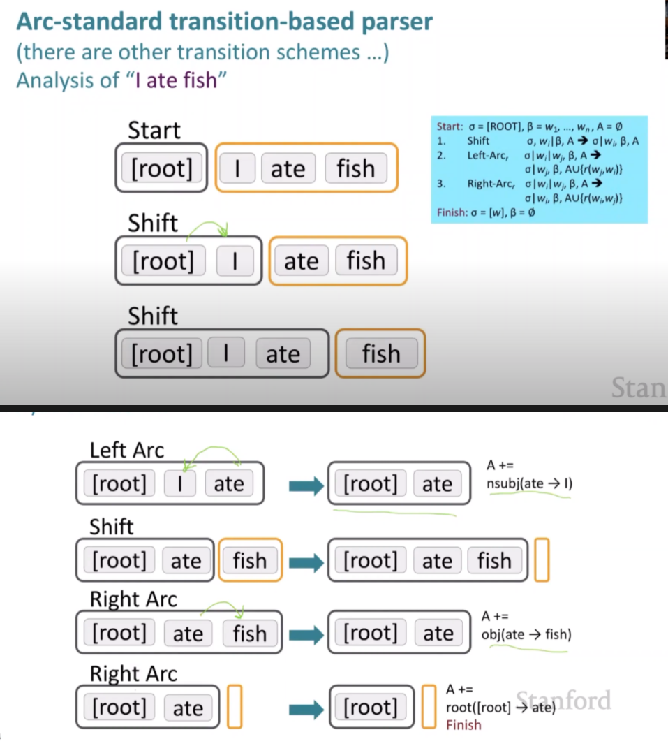 root 까지, 양옆을 단어순으로 reduce 시켜주는 알고리즘으로, 이 transition machine으로 문장을 parsing up 할 수 있다.