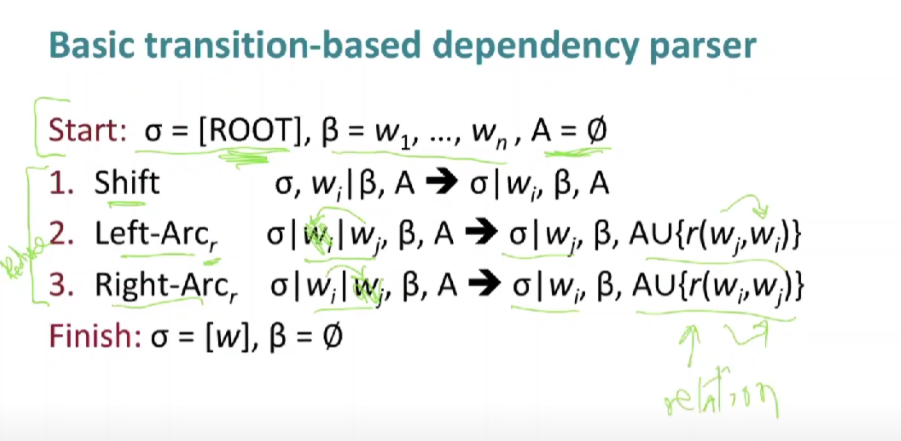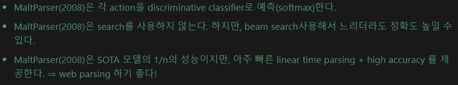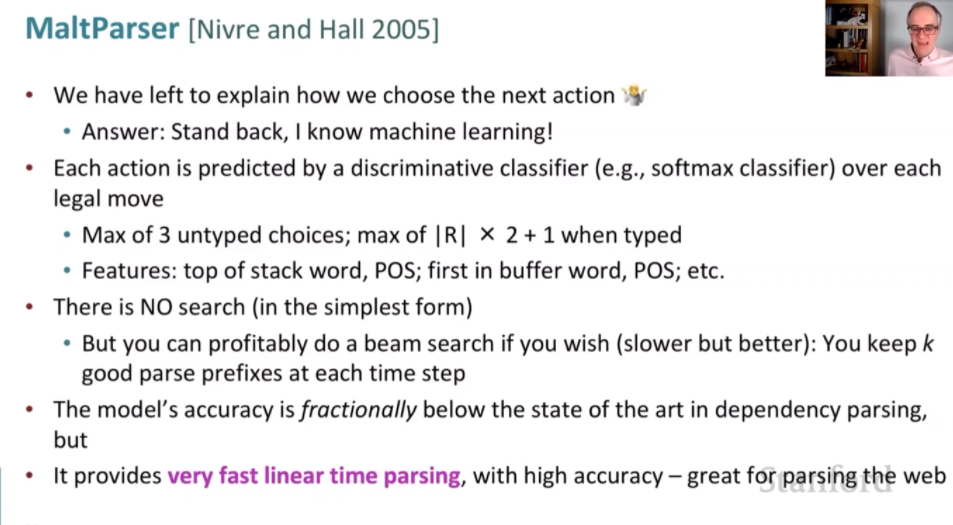 그건은 학습된 ML classifier을 사용한다. 강의에서는 MaltParser(2008)을 사용한다고 설명한다. (구현이 과제이다. 과제 코드는 추후에 또 올릴 예정)
