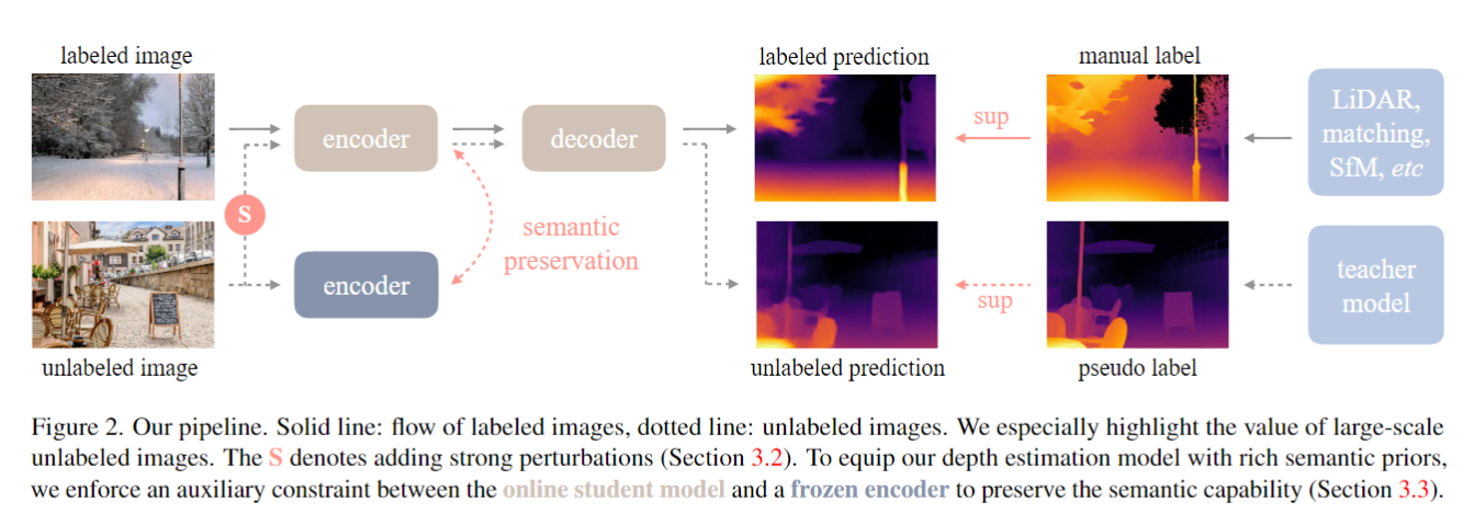 - Monocular Depth Estimation을 위한 Unlabeled images를 pseudo labeling으로 최대한 활용해 주었다.