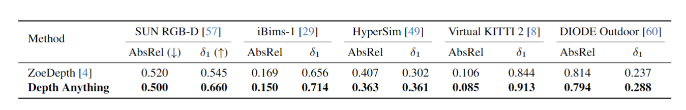 - relative depth esitmation으로 학습한 depth anything 모델을 metric scale로 fine-tuning 시킨 결과로, Depth Anything이 더 좋은 결과를 보임을 알 수 있다.