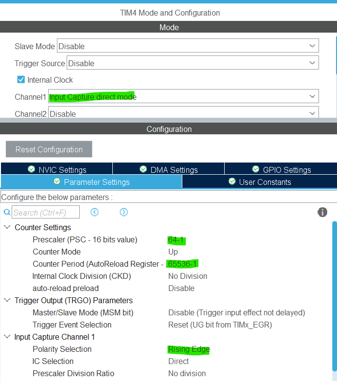 TIM4는 Echo핀의 Rising Edge와 Falling Edge 사이의 간격을 계산하기위해 사용하겠습니다. 이 또한 최대 36mS까지 측정이 가능해야하므로, ARR은 65536-1로 설정하고, 최소 탐지 거리가 3mm(음파가 8.82uS에 이동하는 거리)이므로 prescaler은 64-1로 설정하겠습니다.