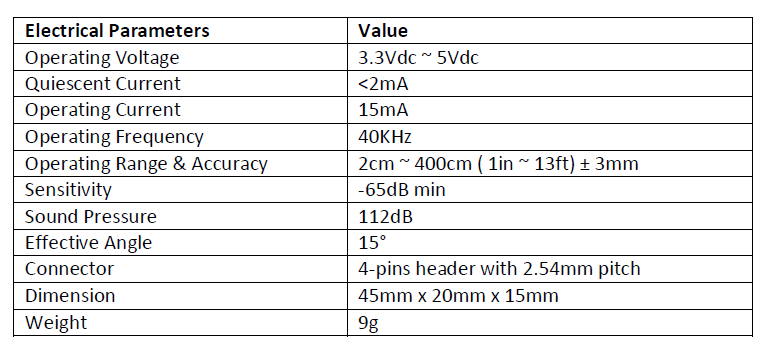 1. 센서가 탐지 가능한 거리는 2cm ~ 400cm(±3mm) 이다.