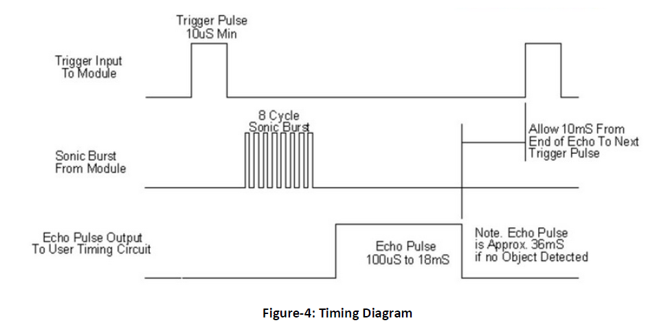 3. Trig핀에 10uS동안 3.3Vdc~5Vdc의 Pulse를 인가해 8 Cycle Sonic Burst를 만들 수 있다.